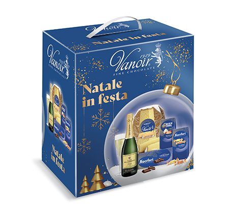 Scatola Natale in Festa Pandoro, Pandoro tradizionale cellophane Vanoir g 500, Spumante millesimato dolce 1880 cl 75, Tavoletta cioccolato al latte ripiena cacao Motta g 100, Canestrelli Baratti & Milano g 80, Morbide gelees alla frutta Sperlari g 100