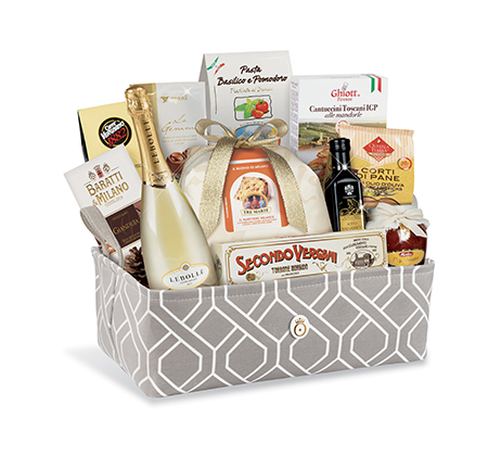Rectangular container in gray and white fabric with optical print, classic Milanese low panettone in cellophane Tre Marie g 750, Spumante brut cuvee royale Le Bubbles Losito and Guarini cl 75, Soft nougat with almonds Historical Image Vergani g 75, Baratti & Milano gianduja chocolate bar g 75, Double bag of chocolate pralines Le Gemme Vergani g 100, Cantuccini Toscani IGP with Ghiott almond g 100, Short bronze drawn pasta with tomato and basil Tarall’Oro g 250, Balsamic vinegar of Modena PGI Carandini gold label cl 25, Peperonata jar of farmer Merlini g 540, Mini breadsticks with olive oil Short bread g 100, Caffè Gran Aroma Vergnano g 125